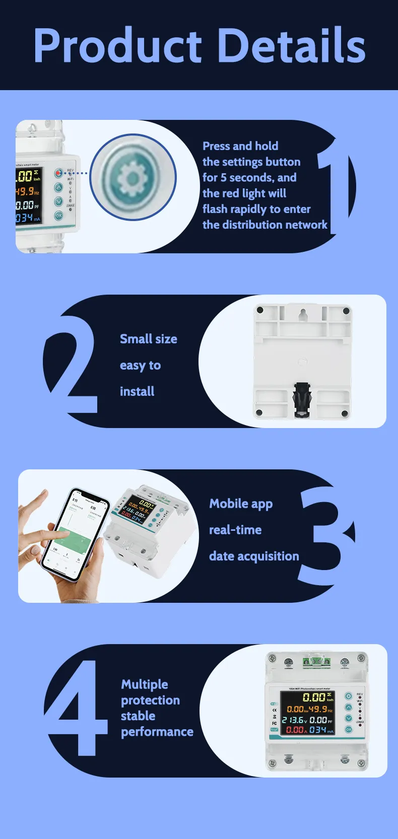 A miénkintelligens túl-/alatti feszültségvédőkFolyamatosan figyelje a bemeneti tápegységet. A rendellenes feszültség észlelése után azonnal levágják a terhelést, hogy megakadályozzák a berendezések károsodását. Az instabil villamos energiával rendelkező területek esetében ez egy alapvető védőeszköz.